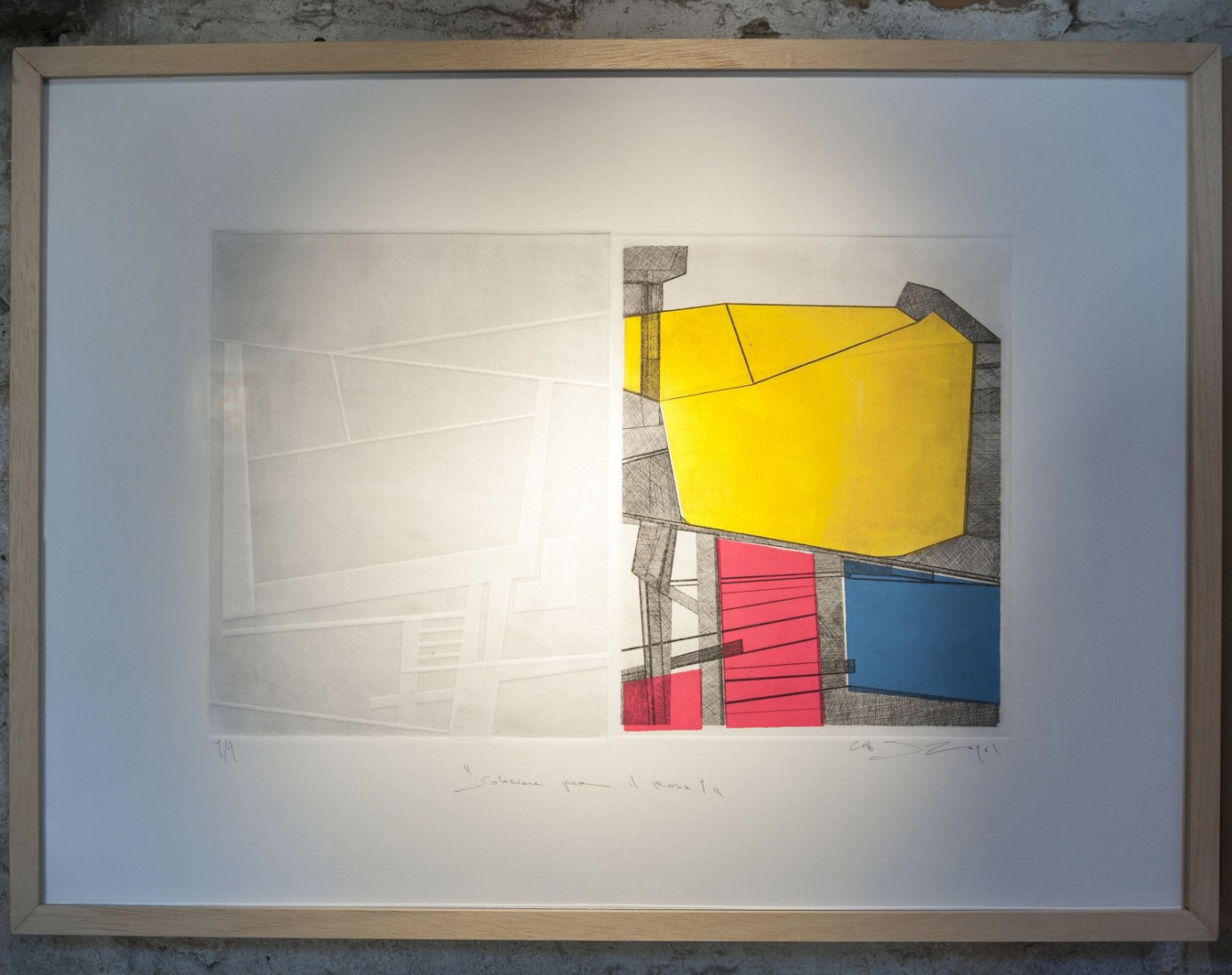 5 etchings on 50% Cotton Magnani paper with 5 ceramic panels, vinyl-based paint,